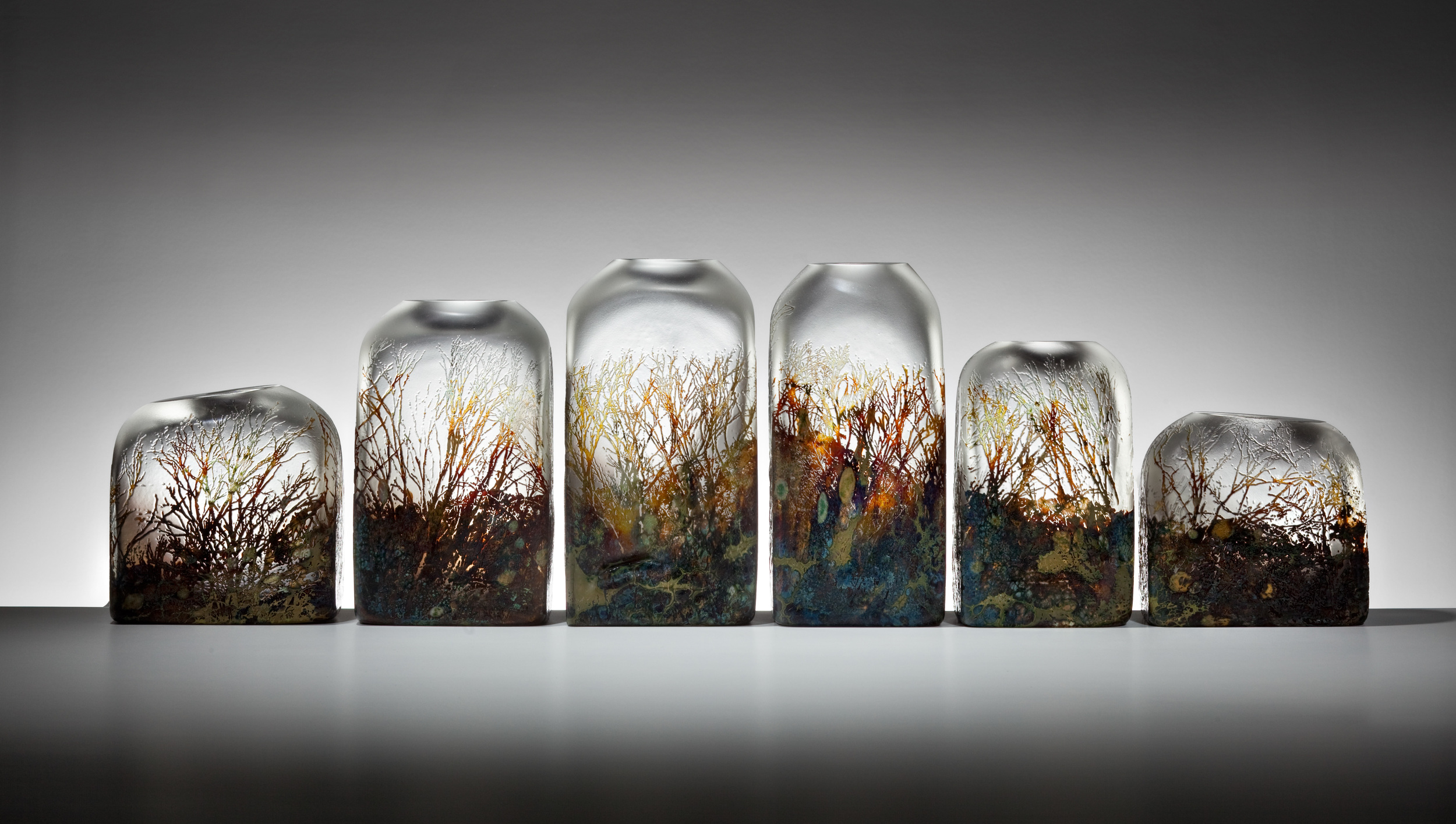 The inherent qualities of glass allow me to translate light and direct my gaze to the sublime details of nature. Creating work that is a culmination of the real and imagined landscapes achieved through a synthesis of modern digital technology with the centuries old tradition of glass blowing.